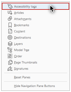To show the Accessibility tags panel, right-click on an empty part of the Navigation Pane, and select from the menu.