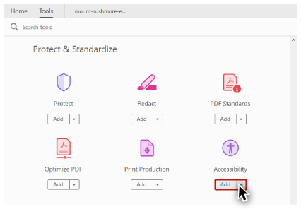 To add the Accessibility tools to the Tools pane, click the tab in the top-left of the window (located next to the Home tab on the toolbar). Find and click the button.