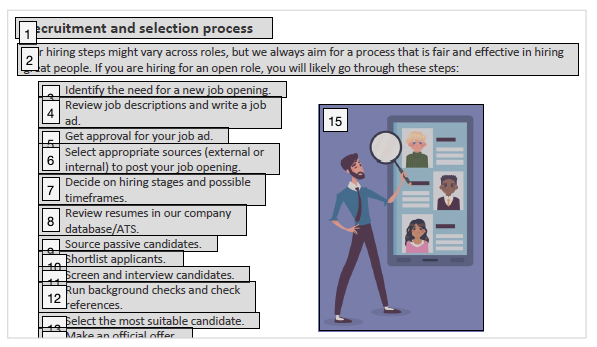 Each tagged item in the document is surrounded by a gray box called a "region." Each region has a label on its top-left corner with a number that indicates the item’s content order on the page.