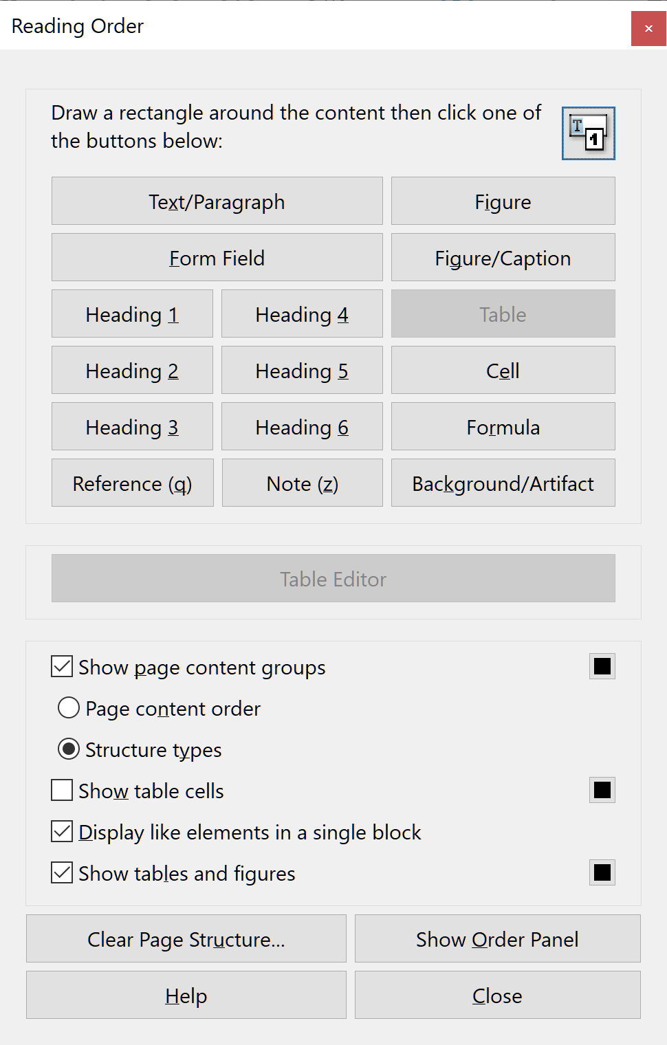 The Reading Order tool helps you review and repair a document's structure. To use this tool, go to the toolbar and select . A dialog appears.