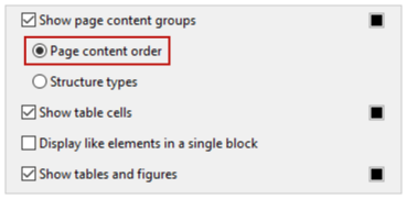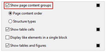 By default, when the Reading Order tool is opened, the "Show page content groups" checkbox is checked.