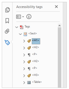 To show or hide this panel, click the Accessibility tags button. You can also add, show, or hide Navigation panes from the main application menu: > > Navigation Panes.