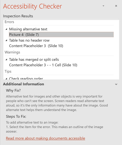 In Windows and Mac, the sidebar will appear to the right. The checker presents accessibility errors (e.g., images with no alternative text), warnings (e.g., unclear link text) and tips (e.g., check slide reading order for slides with custom content). Selecting an item in the report will highlight the issue within the slide. Information about the issue, and instructions on how to repair it, will also appear at the bottom of the sidebar.
