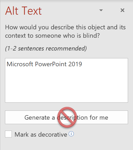 The process to add alternative text is straightforward in PowerPoint 365 and 2019: