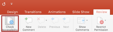 PowerPoint includes a tool that will identify many common accessibility issues. The accessibility checker is basically the same in Windows and Mac, but the steps to start the check are different.