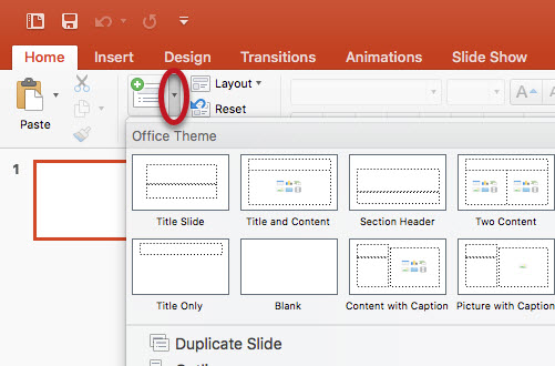 You can also select the slide layout while creating a new slide. In Windows, select either the or the text "" right below the icon, and a menu will drop down with all the available slide layouts. Select one of these options to create a new slide with this layout.