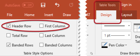 In HTML, there are ways to identify row and column headers in a data table that make the contents of the table much more accessible to screen reader users. PowerPoint allows you to identify a single row of column headers and a single column of row headers. To identify the headers in a table: